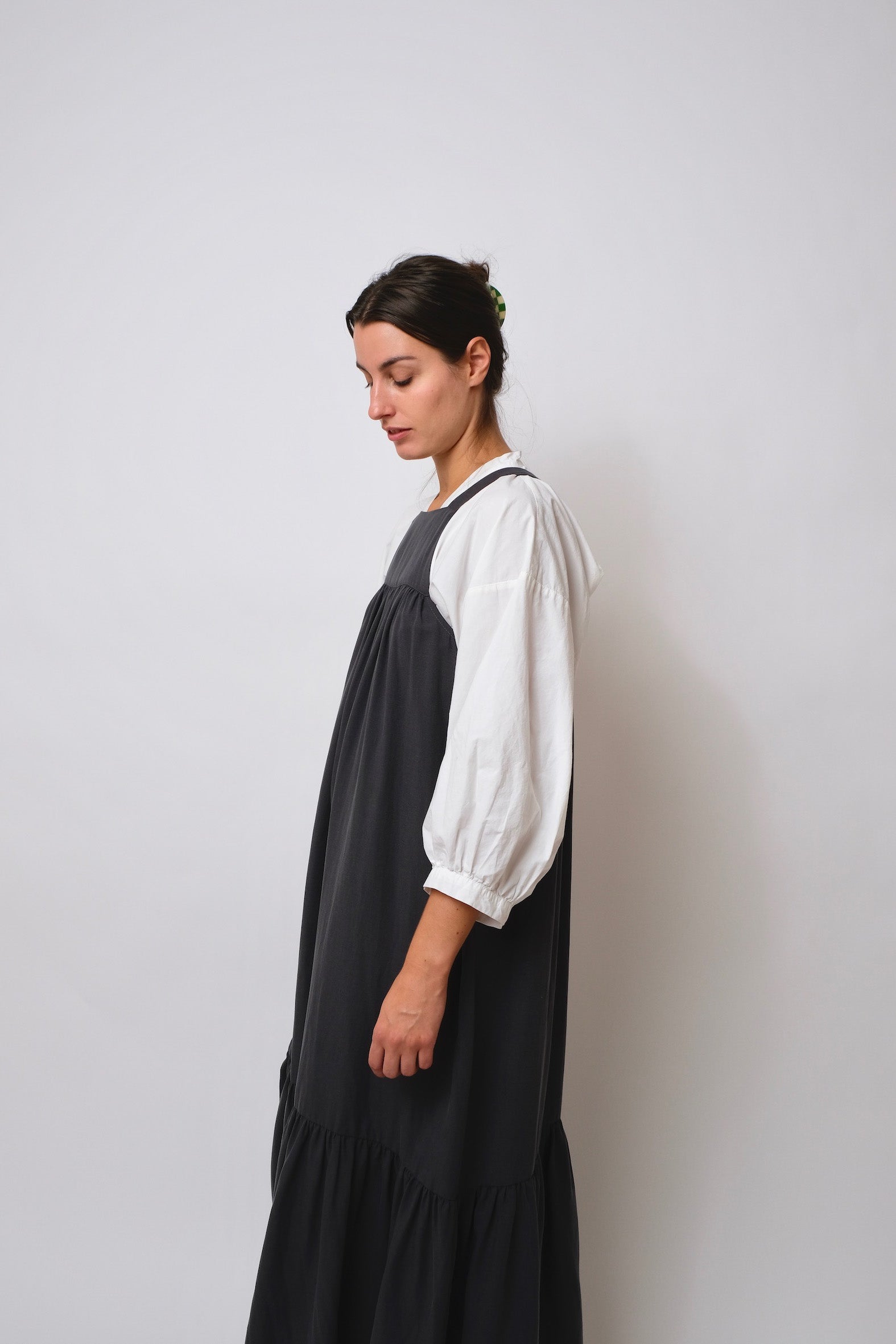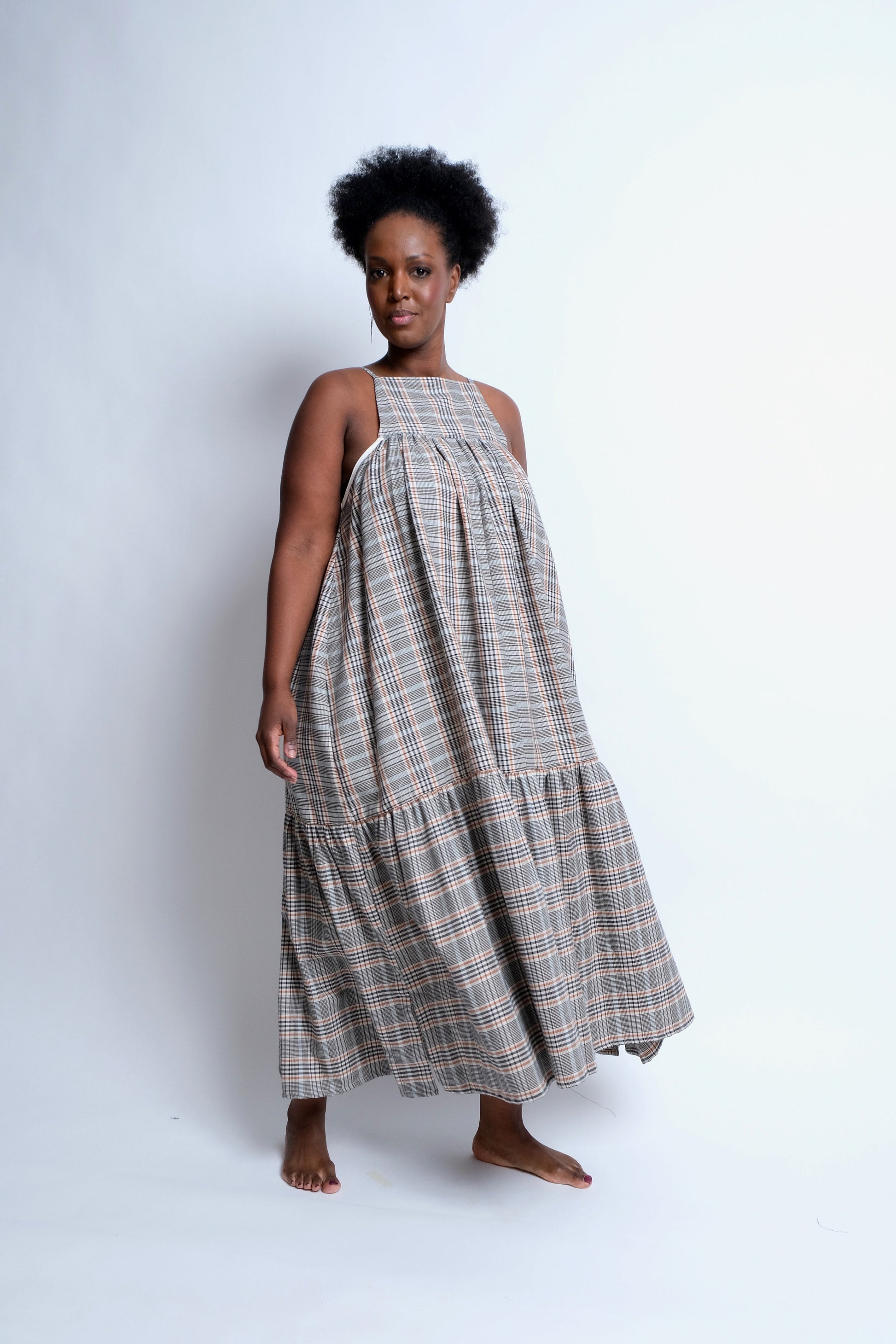This dress has an above the bust self lined panel, the A-line dress below this is gathered on. There is also a bottom gathered tier that can be added to the dress and a gathered sleeve with an elasticated hem. The sleeve is hand sewn to the strap and underarm after the dress has been fully made.