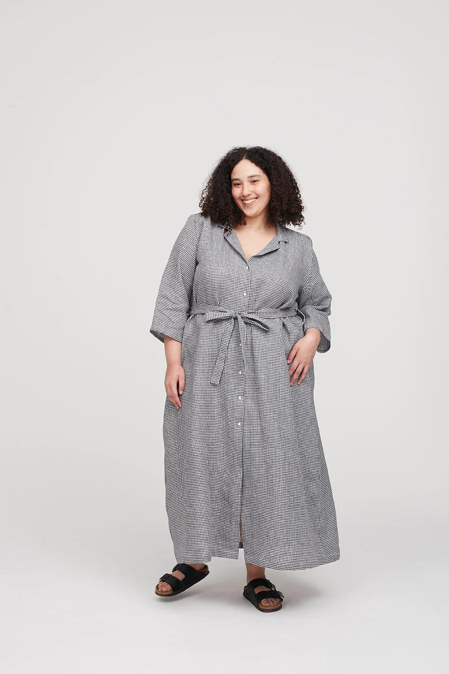 The Celia Dress is a classic, long length dress with a collar, lapels, two-piece sleeves and an optional tie belt. It is fitted on the shoulders and features an a-line cut with plenty of room for comfort and movement.