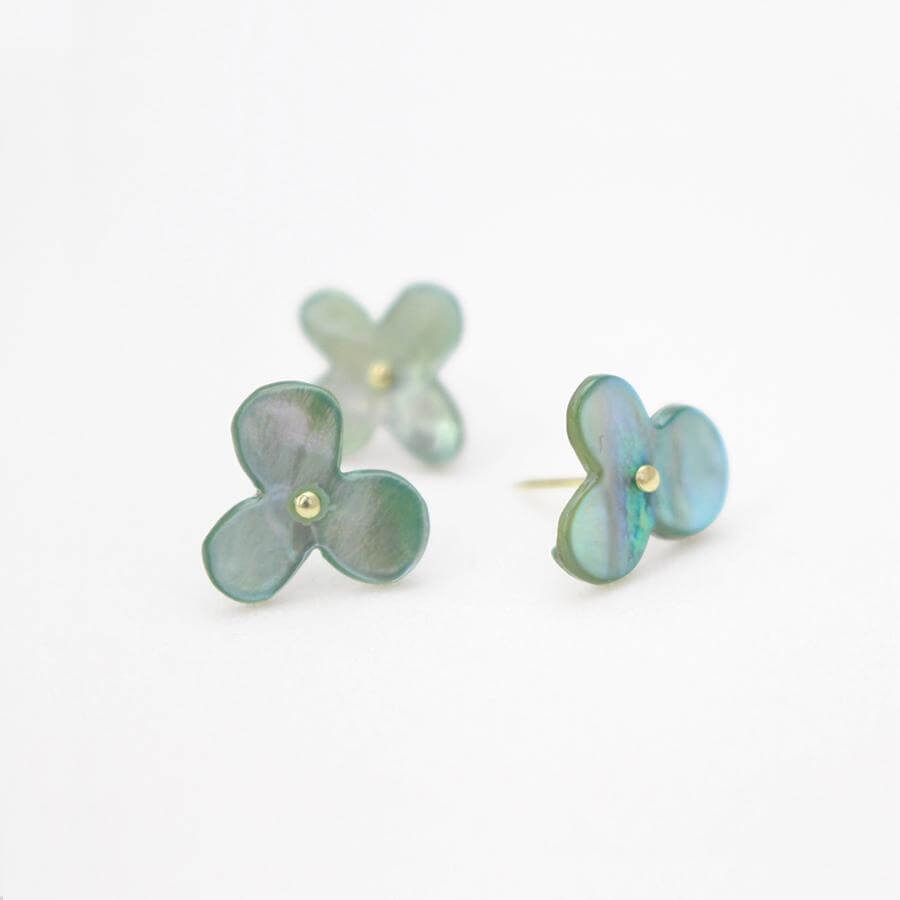 I am the prettiest set of three iridescent, flower-shaped push pins in grey. My button is cut from the Akoya shell, or mother of pearl, in a gentle design reminiscent of hand drawn flowers. Combined with the natural curves of the original shells, each piece is unique in its beauty.