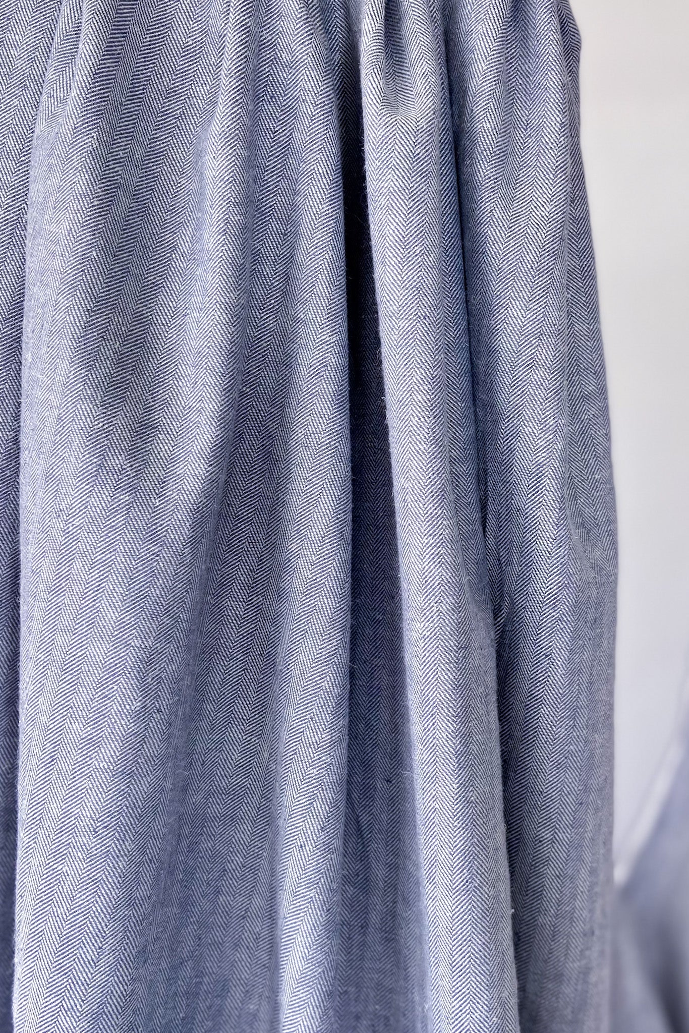 I am a midweight woven fabric with a herringbone pattern and slight tweedy look although lighter, softer and more refined. Organic cotton makes me soft and drapey and hemp adds durability and character. My cool light blue and white pattern is perfect for summer and pairs beautifully with most colour palettes.