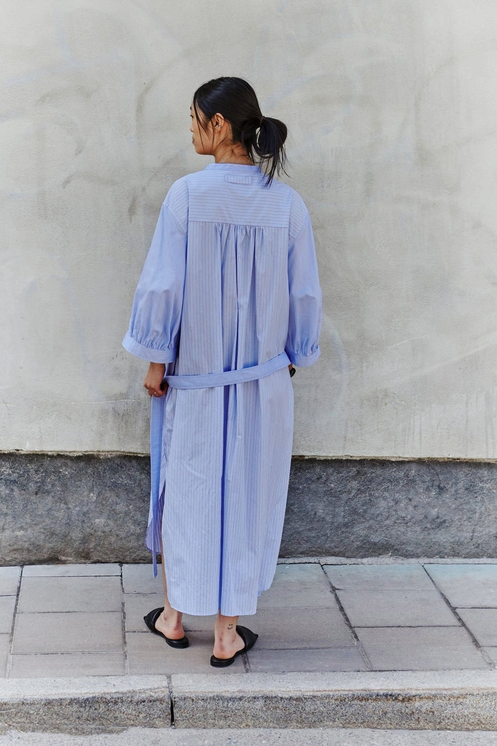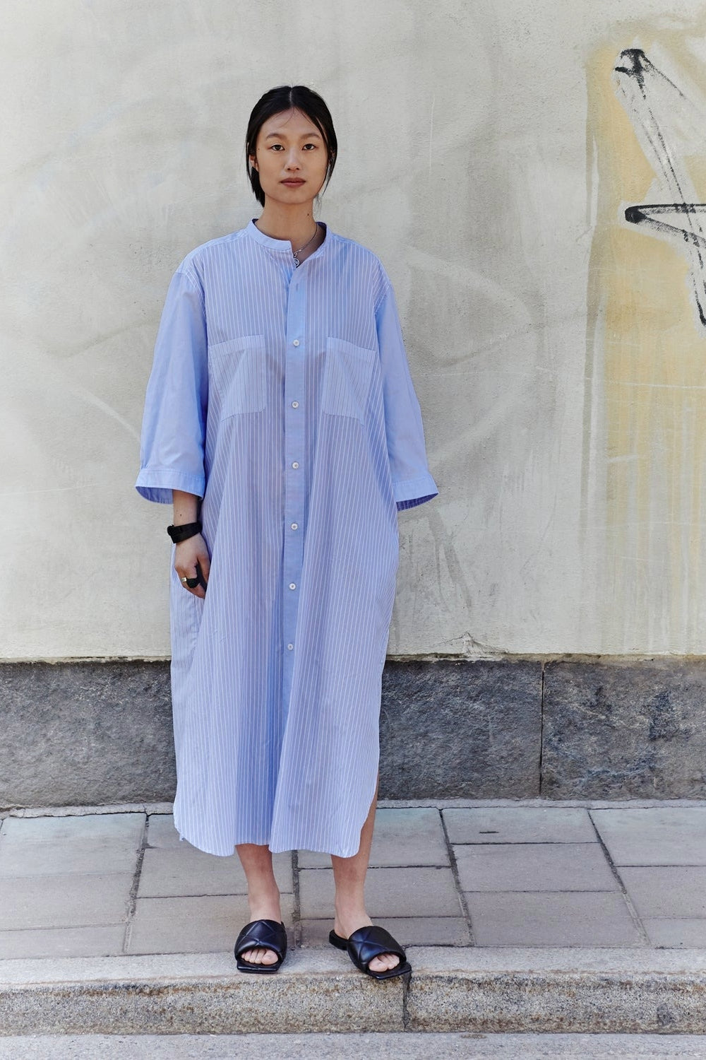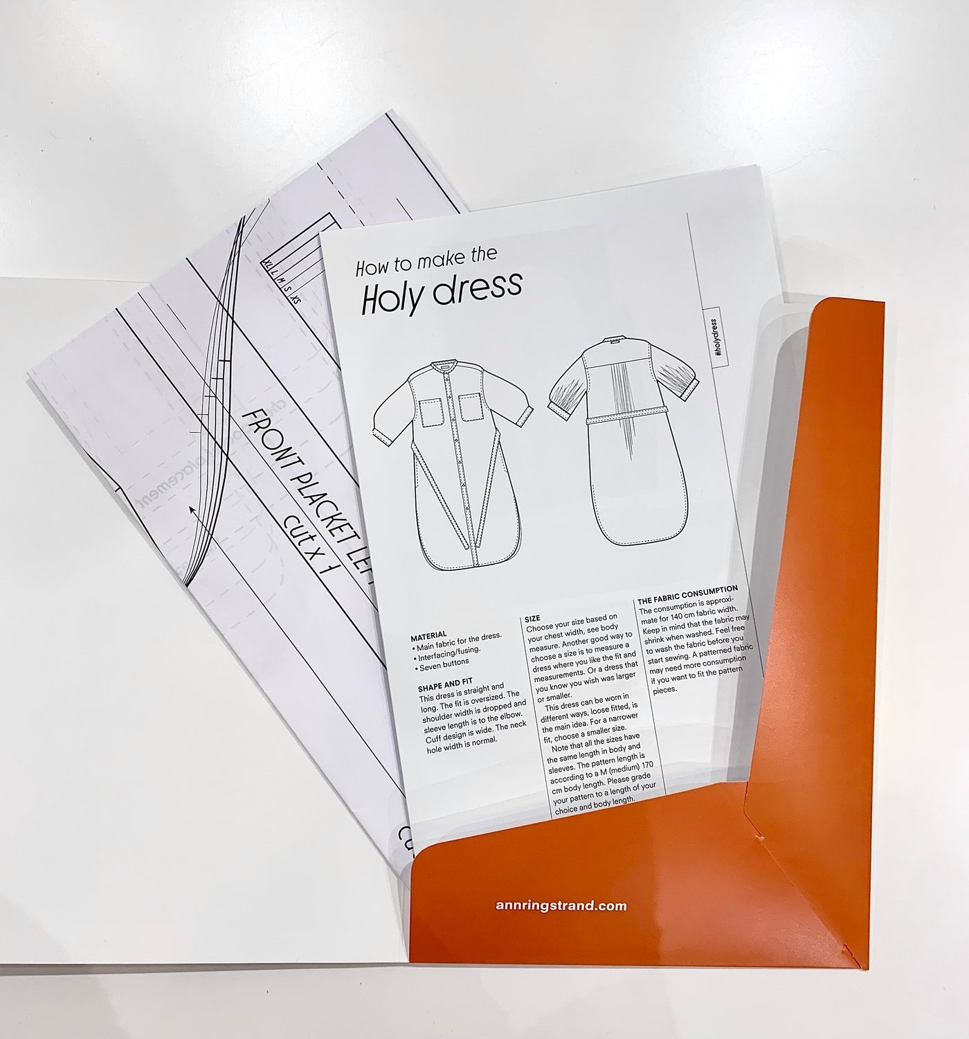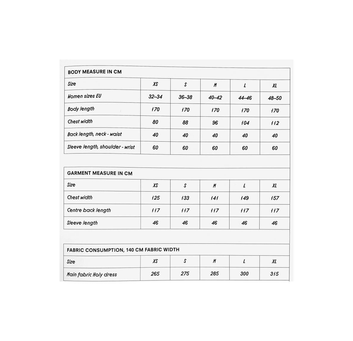 The Holy Dress by Ann Ringstrand is long and straight with an oversized chest width.It has a low stand-up collar, slanted shoulders and the sleeves are wide and cropped to the elbow with a gathering detail at the back. There are two chest pockets, two side pockets and an optional belt.