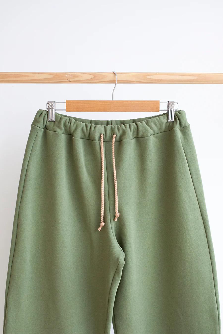 They are high waisted with an elasticated waistband, (optional) drawstring cord and curved patch pockets at the back. The leg is relaxed and features ankle cuffs at the bottom to give the optional turn up a bit more style.