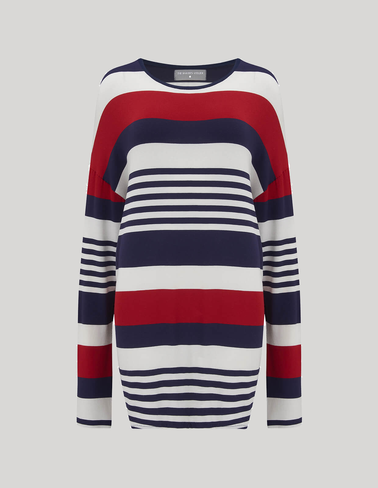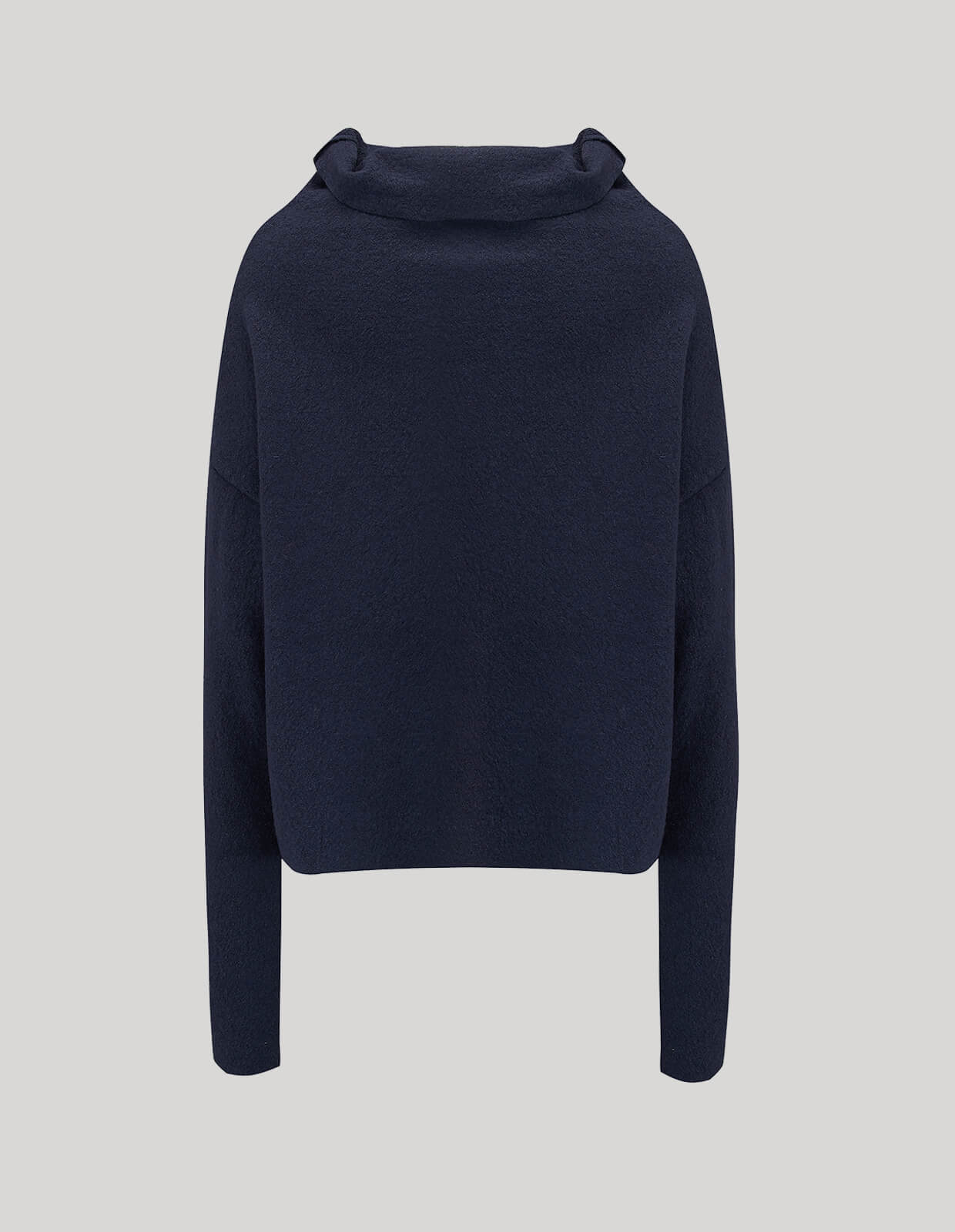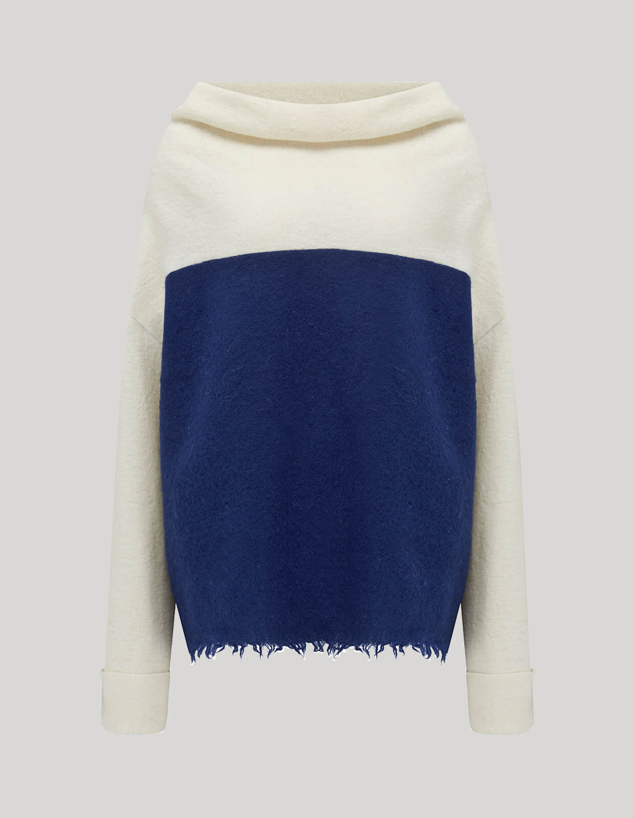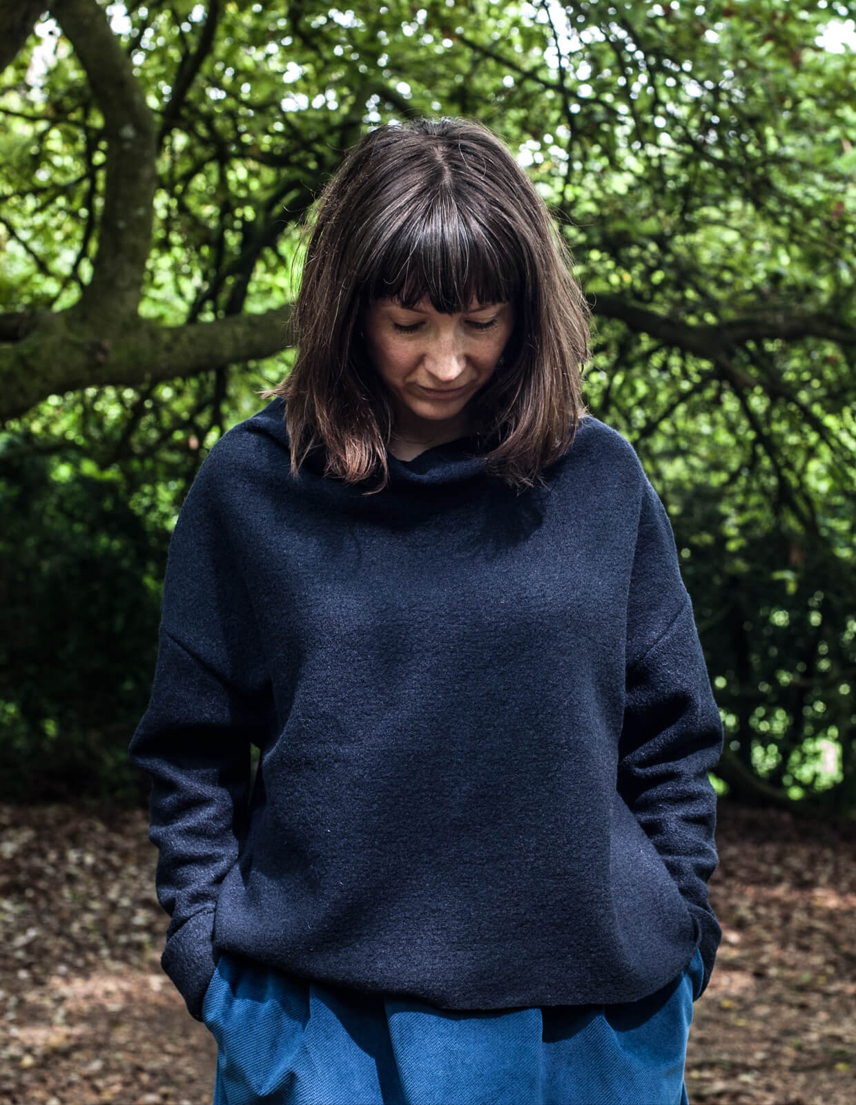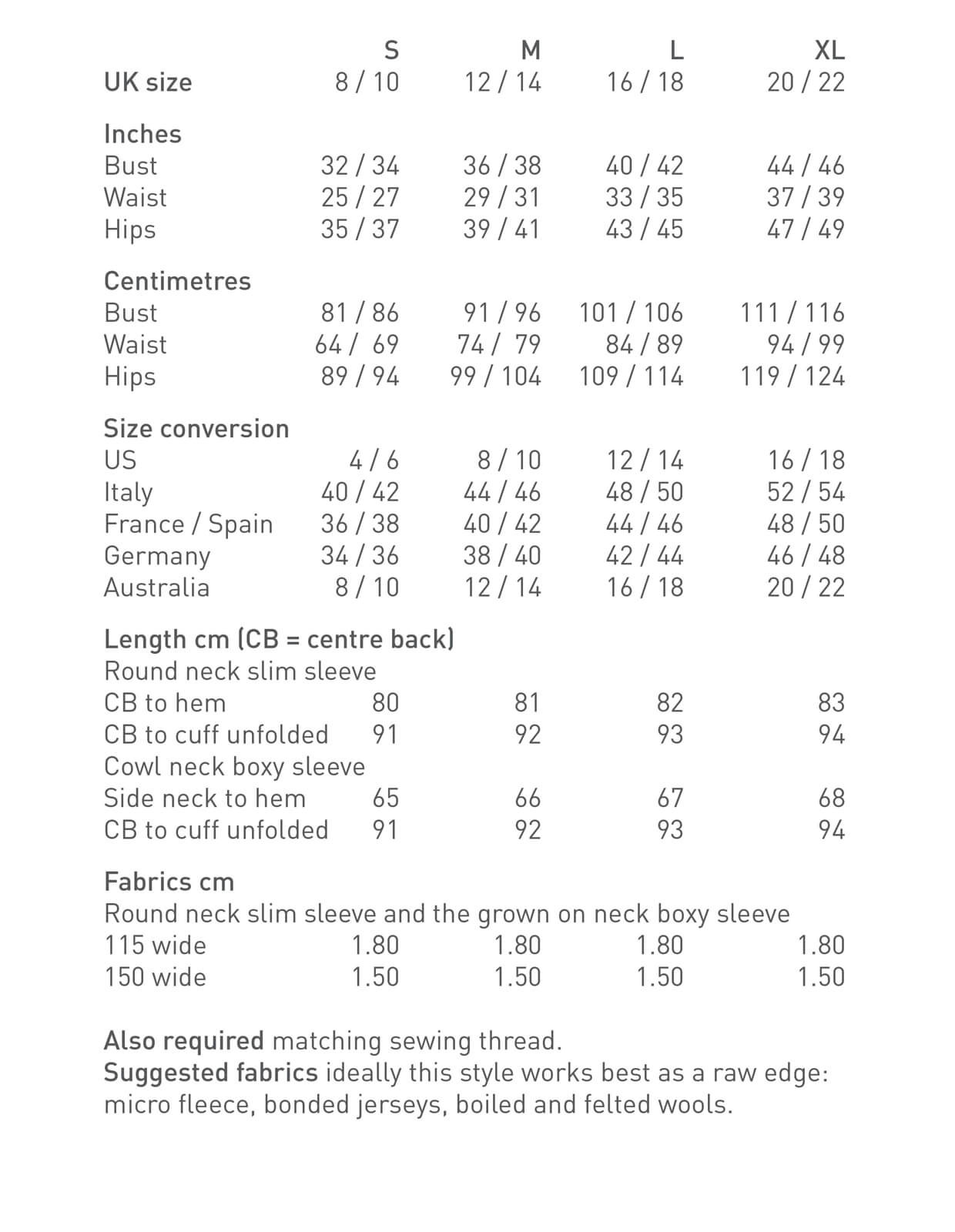 Choose between a round neck, cocoon shape or a more boxy style with a grown on funnel neck. The pattern comes with the option of two sleeve widths that fit both styles.