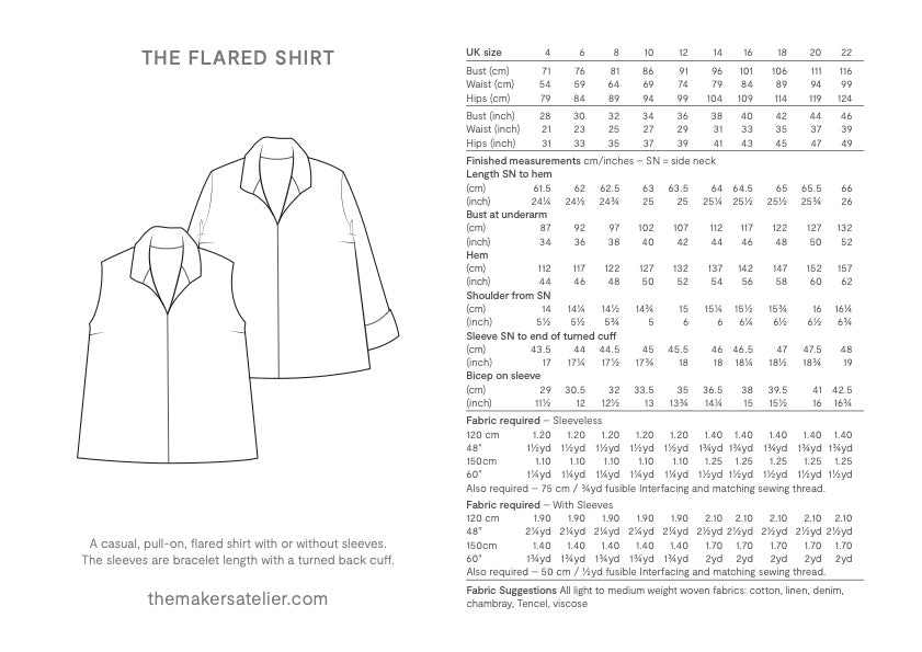 The Flared Shirt is a casual pull on shirt with a flared silhouette for a feminine edge. There are two style options - with or without sleeves. The sleeves are bracelet length with a turned back cuff.