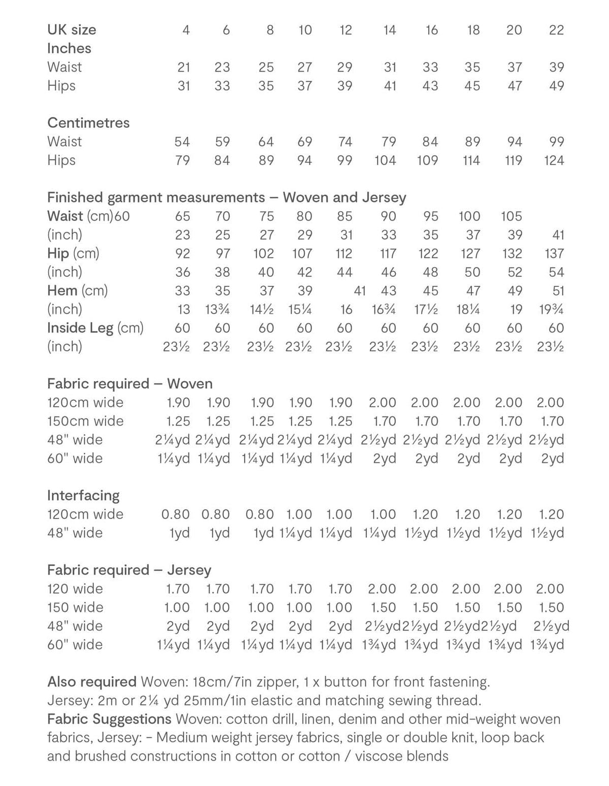 Recommended Fabric: Midweight woven fabrics such as cotton drill, linen denim or tencel twill. For a comfortable, pull on style try midweight jersey fabrics, single or double knit, loop back and brushed constructions.