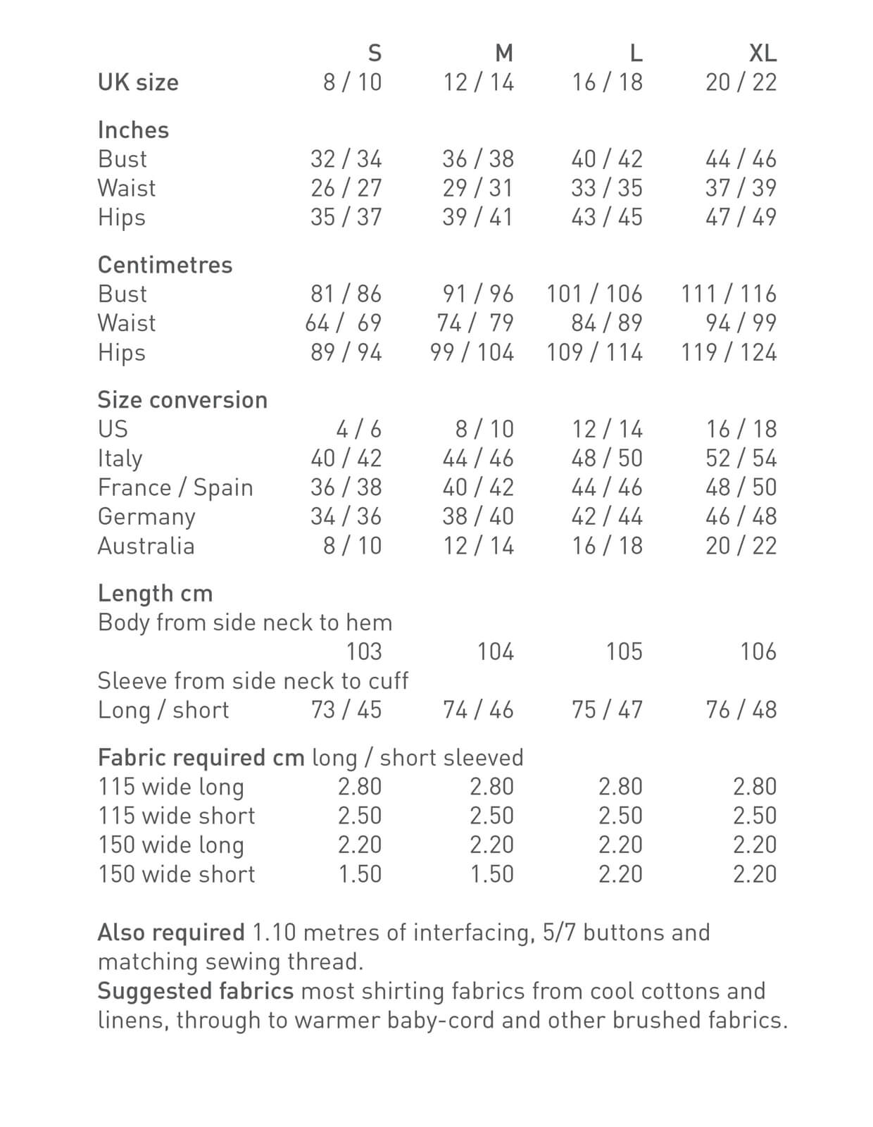 Recommended Fabric: Light to mid weight shirting fabrics in cotton, linen or hemp or opt for a more fluid drape with tencel or viscose.