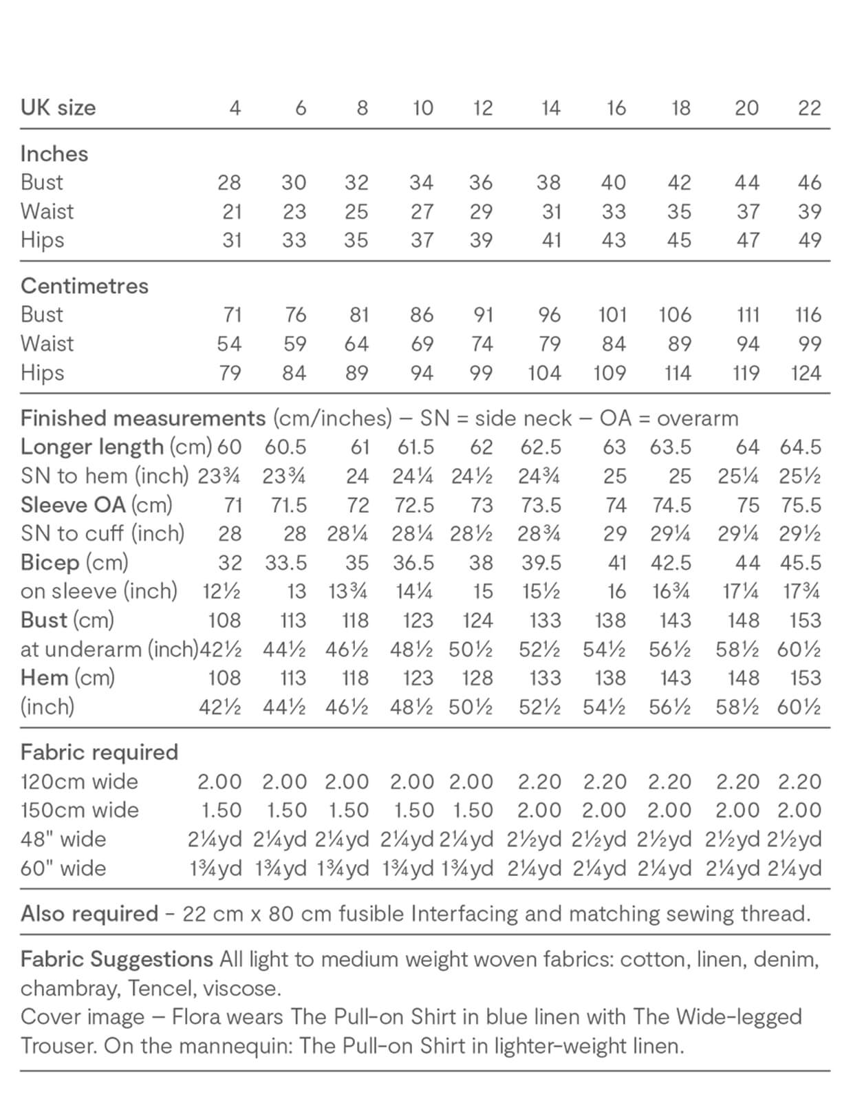 Sizing + Fabric Requirements: Please refer to the chart in the images.