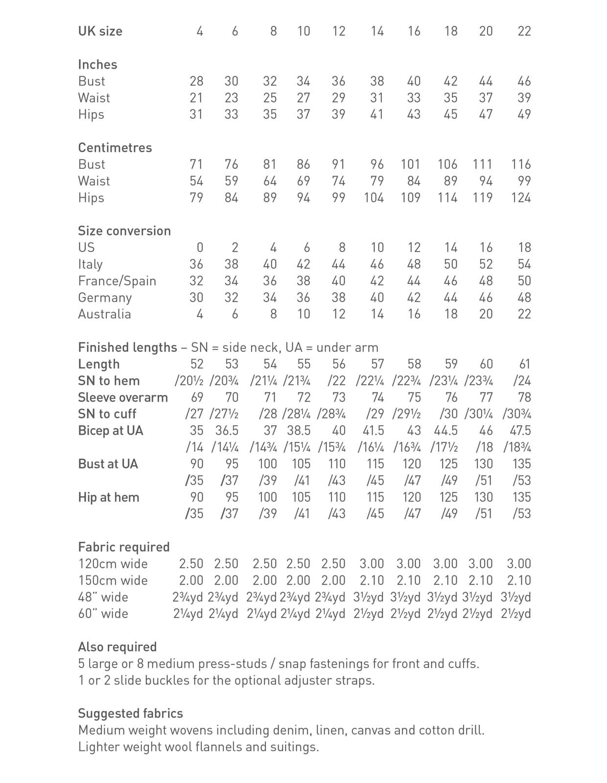 Recommended Fabric: Midweight fabrics such as cotton, linen, denim, canvas, tencel twill or lightweight wool suiting.