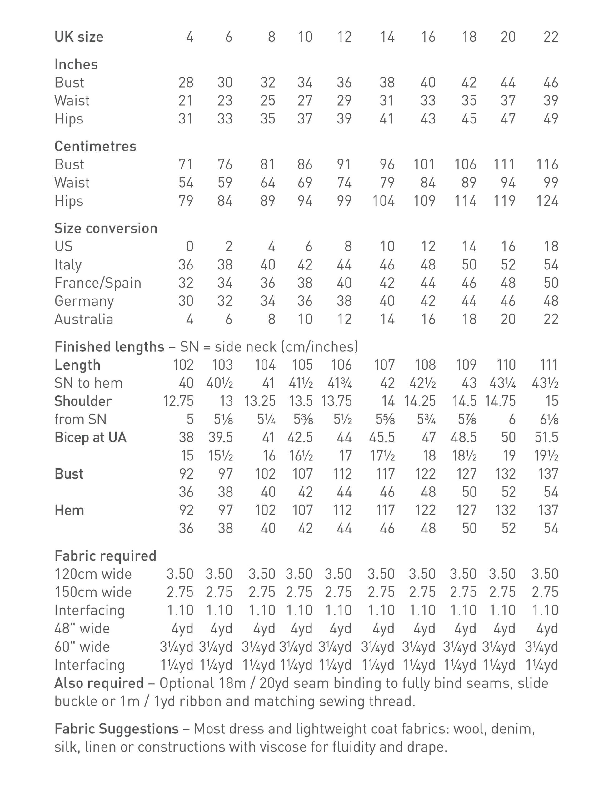 Recommended Fabric: Suitable in a wide range of dress weight fabrics with structure or drape depending the preferred look.