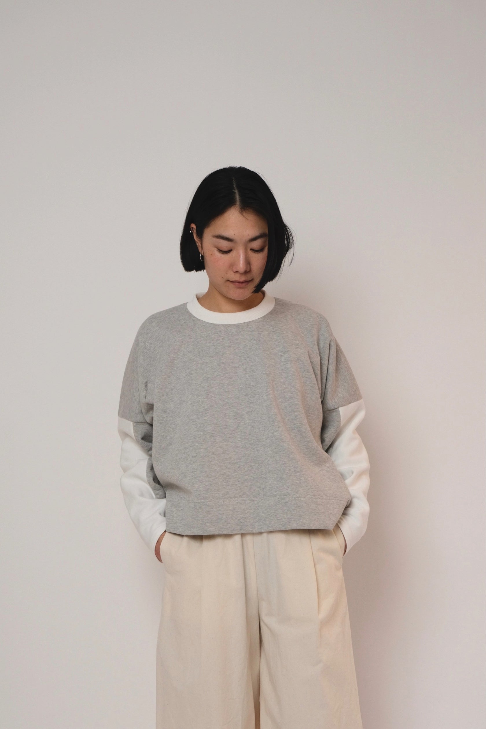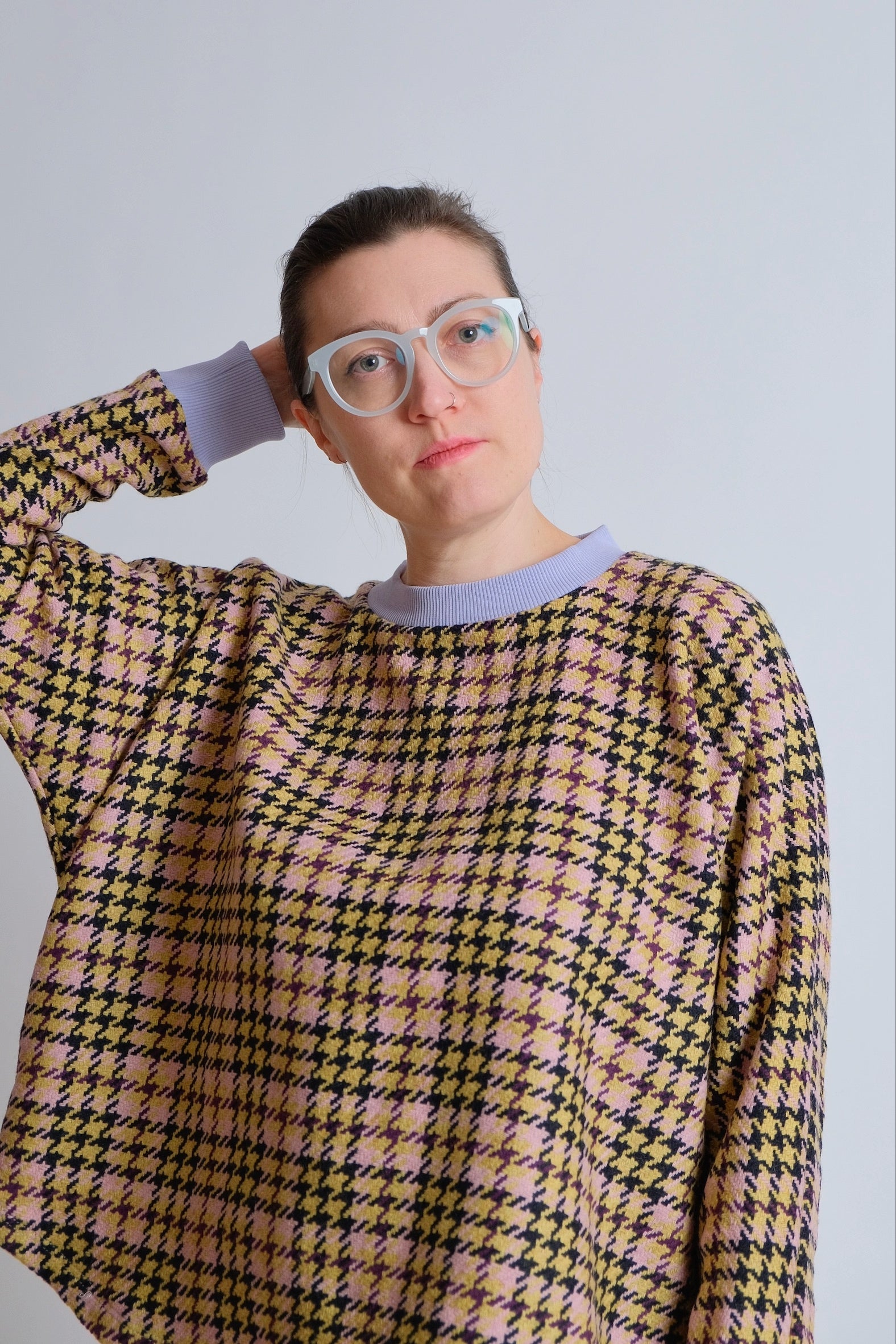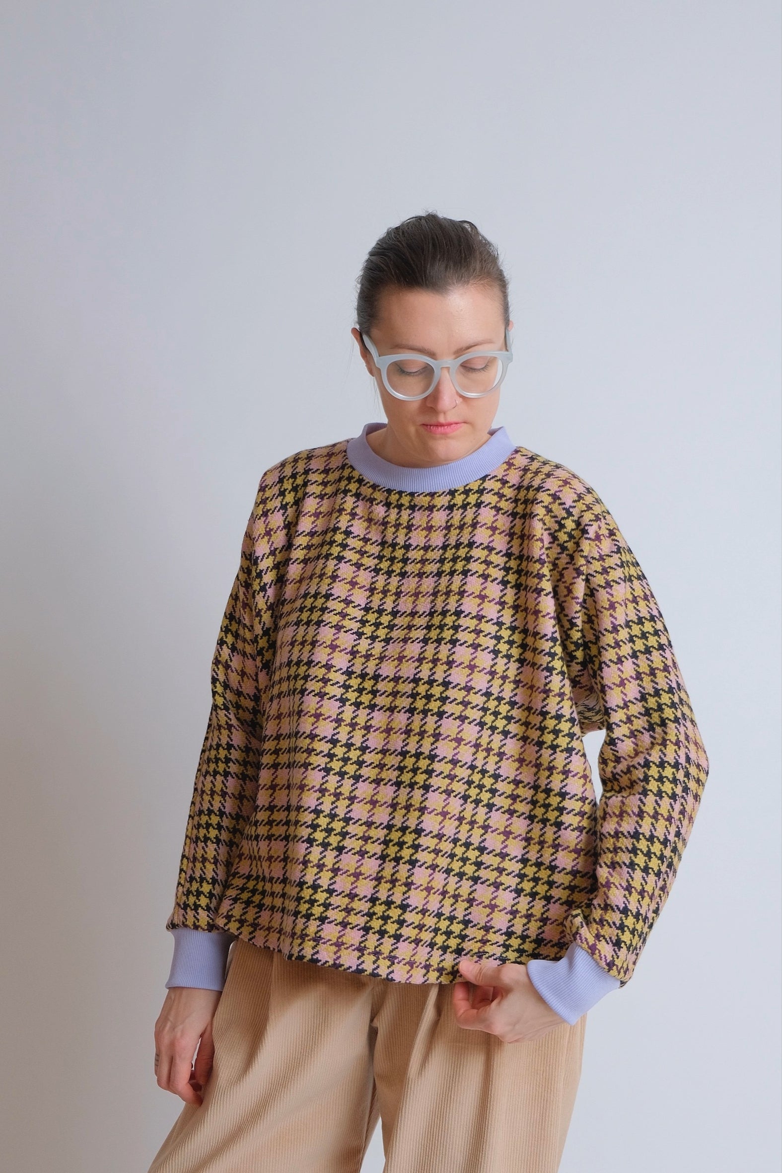 The ZW Jumper by Birgitta Helmersson has an oversized body with a curved hem and a slim fitting sleeve making it perfect for layering. The body size and sleeve length are determined by the width of the fabric. The crew neck features a ribbed neckband and the sleeve hem has a ribbed band attached when using narrower fabric widths.